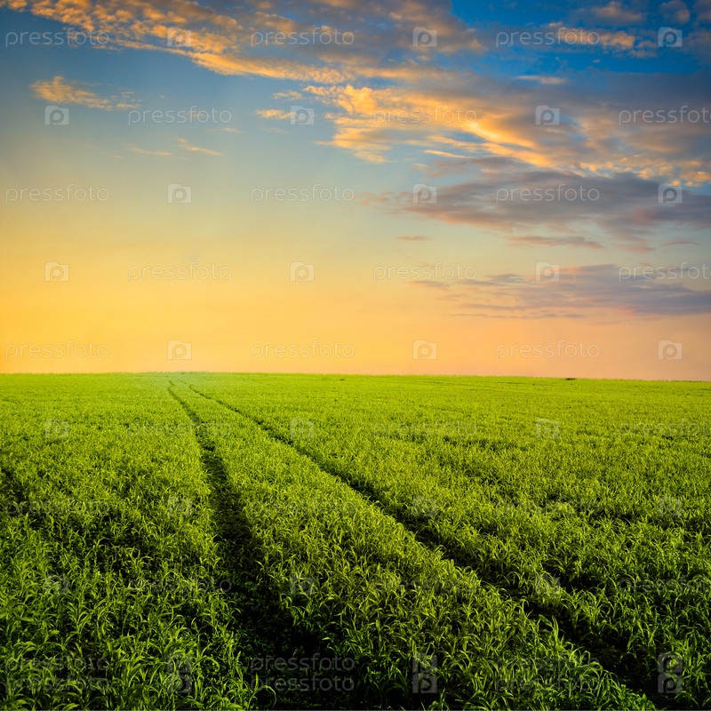Путь через зеленое поле на закате