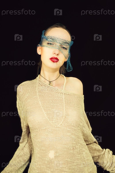 Молодая женщина в вуали и свитере на черном фоне