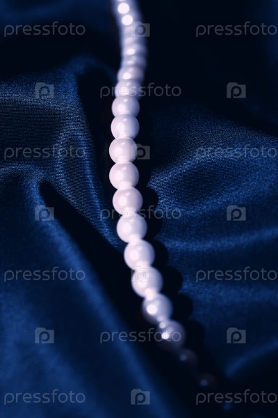 Белое жемчужное ожерелье на синем шелке крупным планом