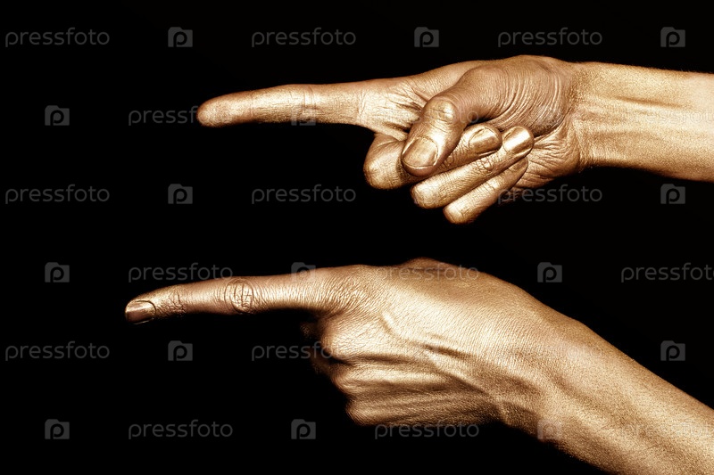 Мужские руки в золотой краске указывают влево