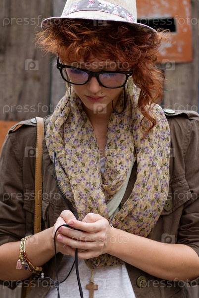 Девушка смотрит на свой mp3-плеер