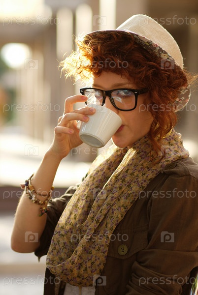 Рыжеволосая девушка-хипстер пьет кофе на открытом воздухе