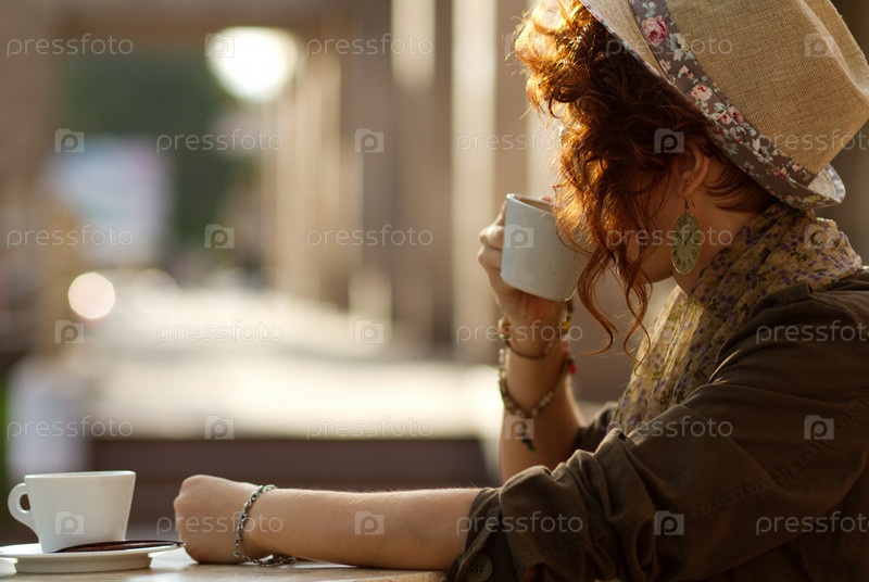 Рыжеволосая девушка ждет кого-то в кофе на открытом воздухе