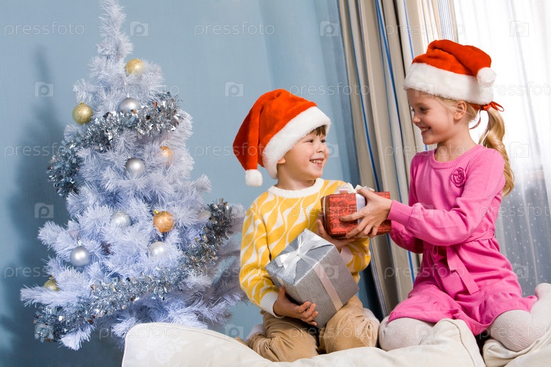 Портрет счастливых братьев и сестер, обменивающихся рождественскими подарками дома