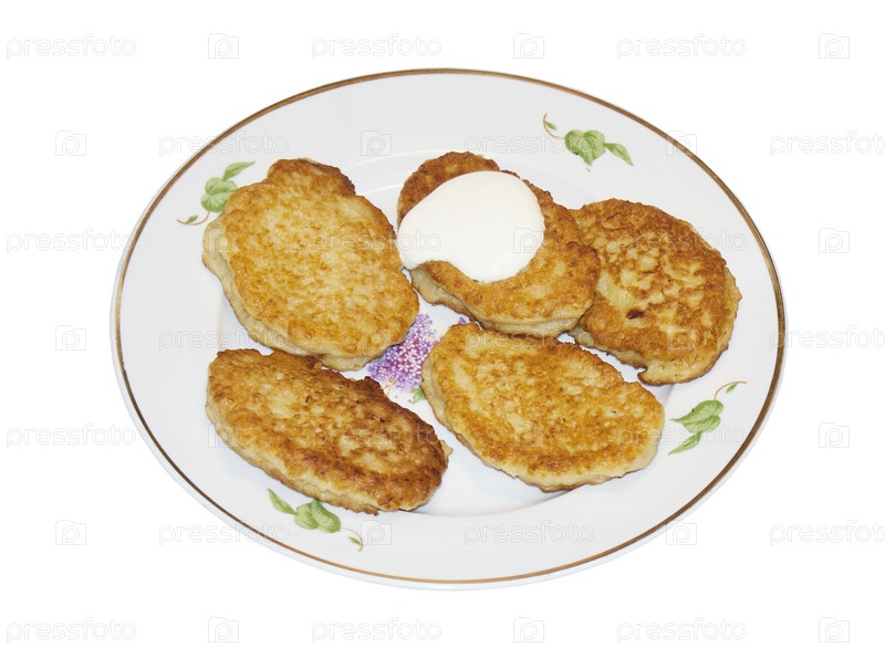 Оладьи со сметаной на белом фоне