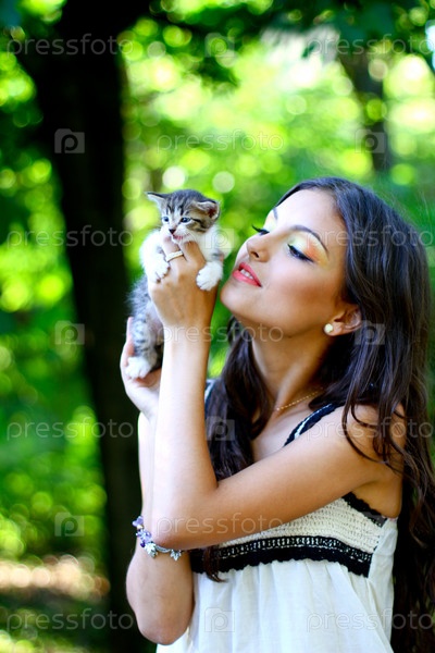 Хорошенькая девушка с милым котенком на руках