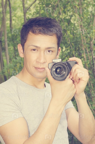 Красивый молодой человек держит камеру