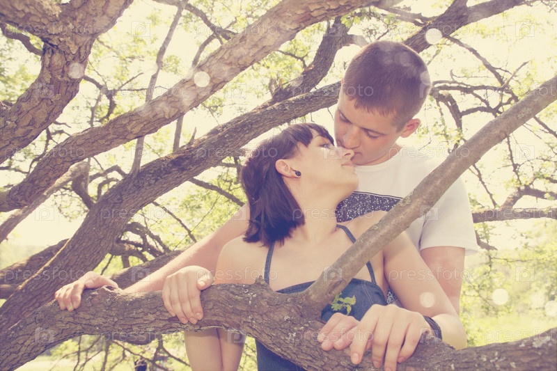 Влюбленная пара обнимается в лесу у дерева