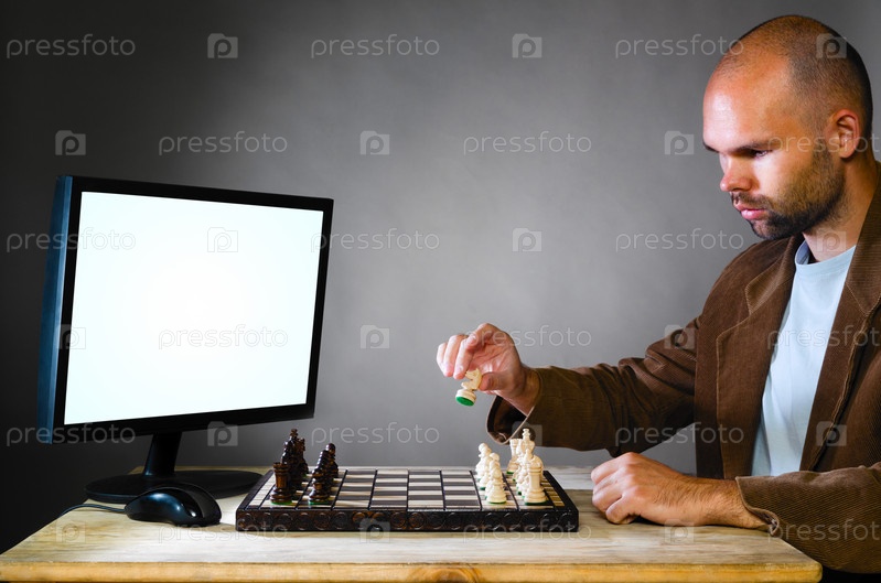 Человек играет в шахматы напротив компьютера на сером фоне