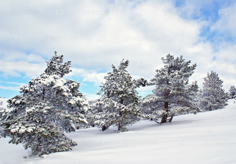 Хвойные деревья в снегу, зимний пейзаж
