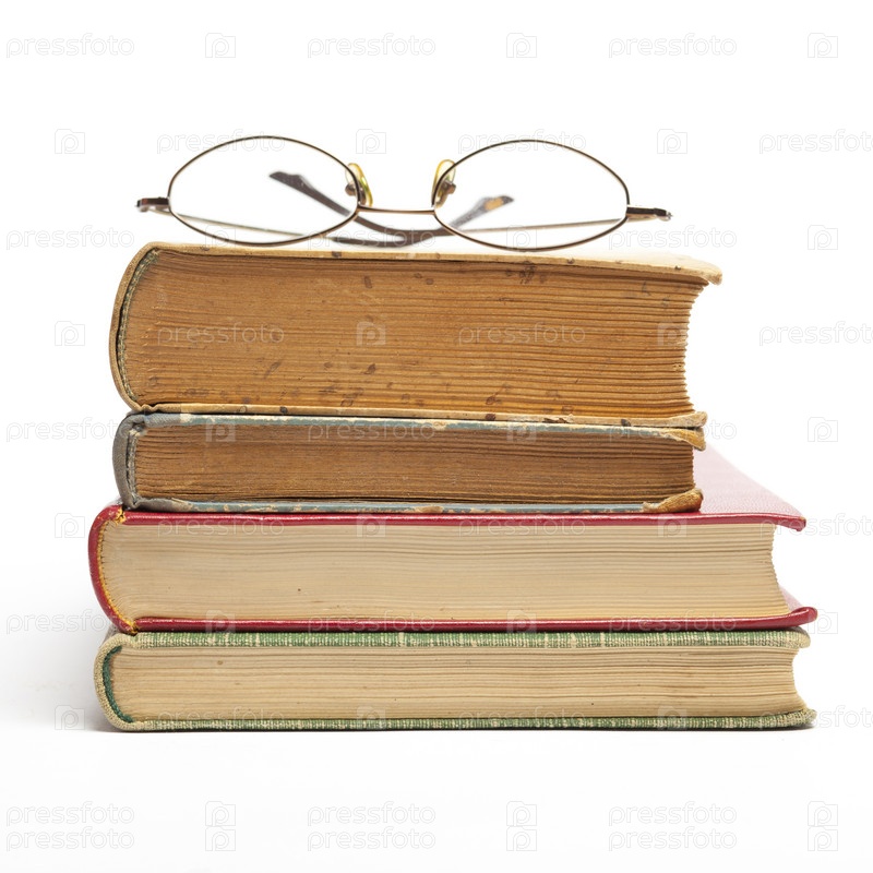 Стопка старых антикварных книг и очки, изолированные на белом фоне