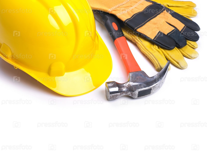 Защитный шлем, молоток и кожаные перчатки на белом фоне