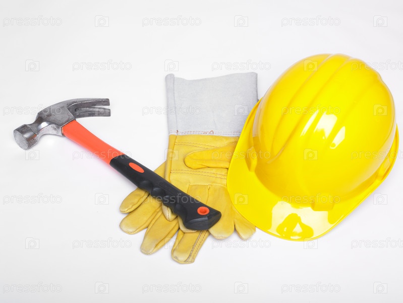 Защитный шлем, молоток и кожаные перчатки на белом фоне
