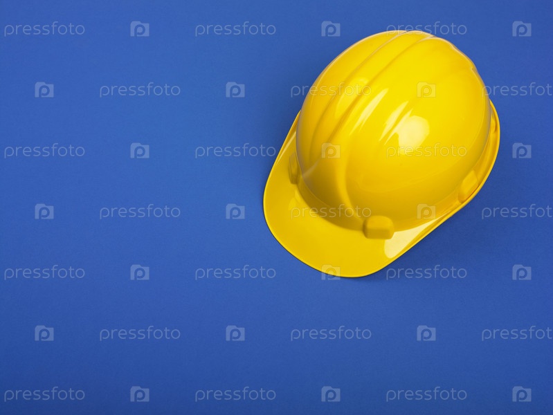 Желтая строительная каска на синем фоне