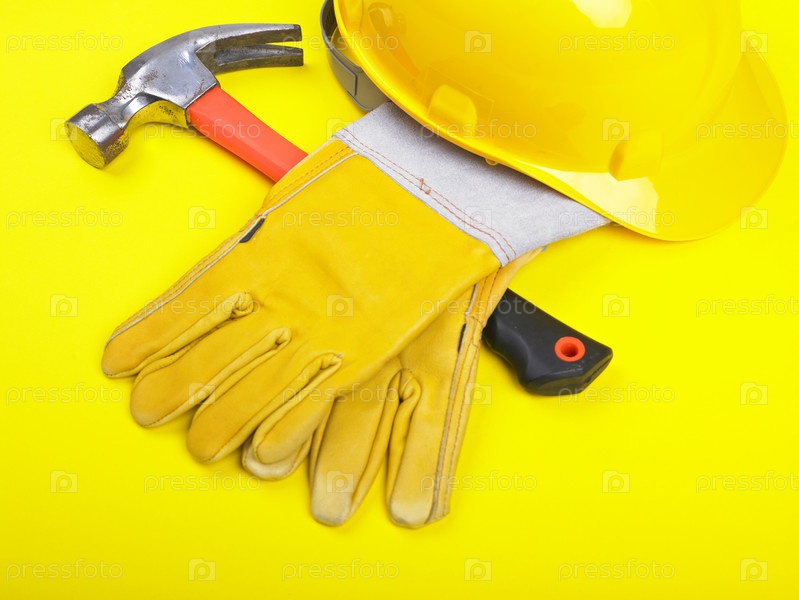Желтая строительная каска, молоток и кожаные перчатки на желтом фоне