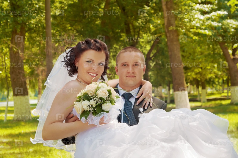 Жених держит на руках невесту в парке