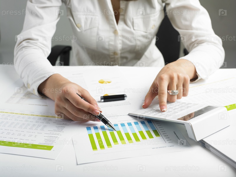 Руки бизнес-леди с ручкой и калькулятором на фоне деловых бумаг