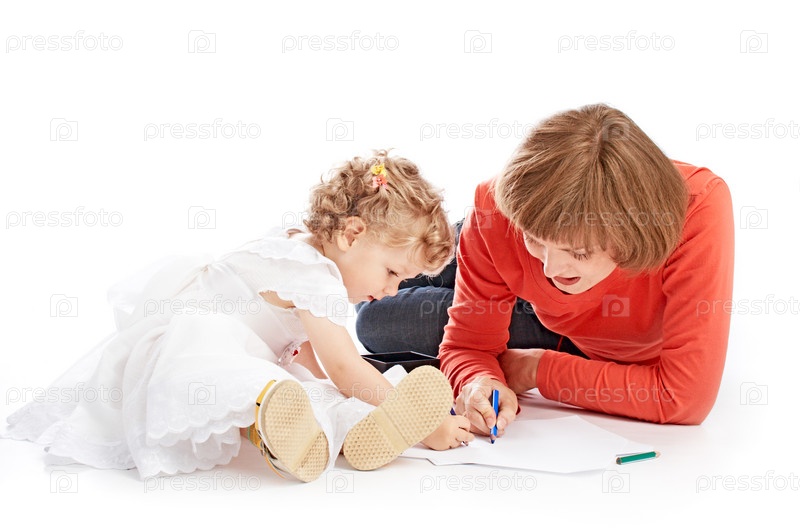 Мама и дочь рисуют, на белом фоне