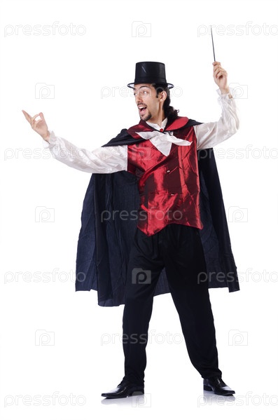 Маг с волшебной палочкой на белом фоне