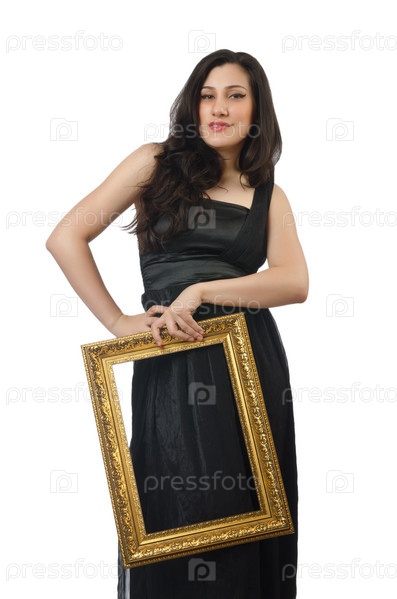 Женщина с фоторамкой на белом фоне