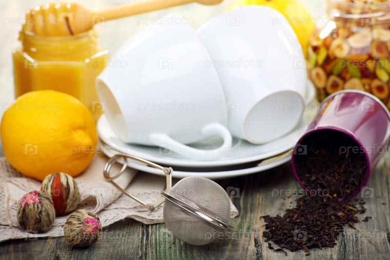 Две чашки, чай и мед на деревянном столе