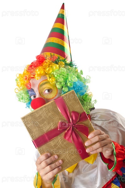 Забавный клоун с подарком в руках