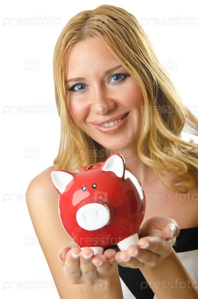 Женщина с копилкой на белом фоне