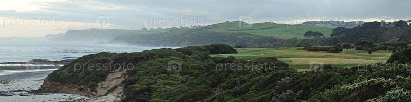 Поле для гольфа, берег океана, скалы, зеленые холмы и облачное небо рано утром в штате Виктория, Австралия