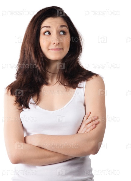 Красивая задумчивая енщина смотрит вбок на белом фоне