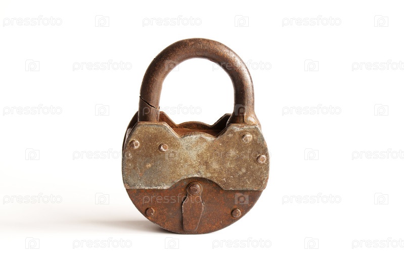 Ржавый сломанный металлический замок на белом фоне