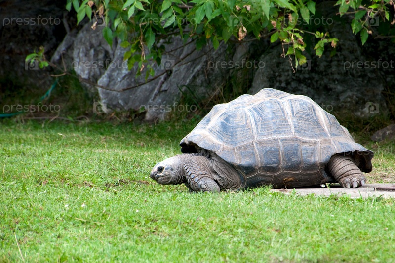 Огромная черепаха на траве на фоне серых камней и деревьев