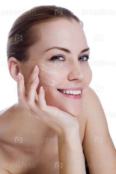 Счастливая молодая женщина наносит крем на лицо