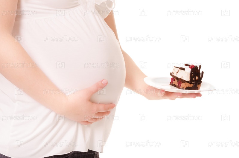Беременная женщина держит сладкий торт на тарелке