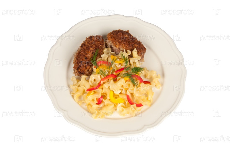 Шницель и макароны на белом фоне