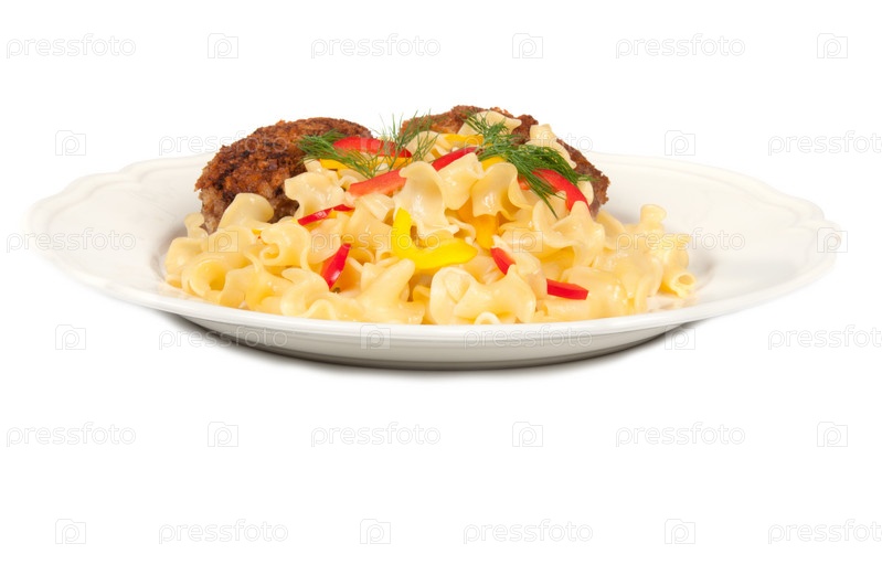 Шницель и макароны на белом фоне