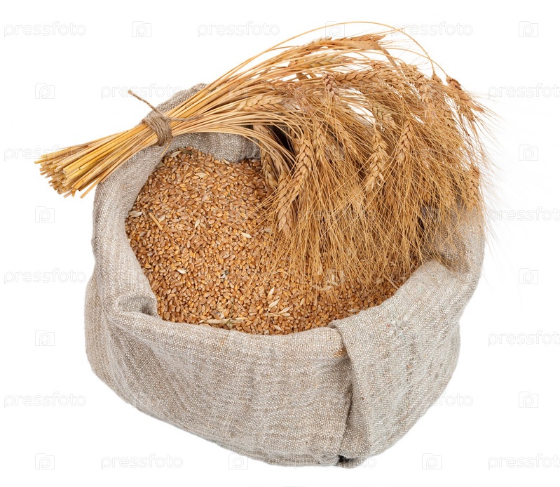 Мешок с зерном и колосьями пшеницы