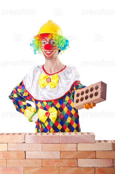 Концепция плохого строительства с клоуном, кладущим кирпич