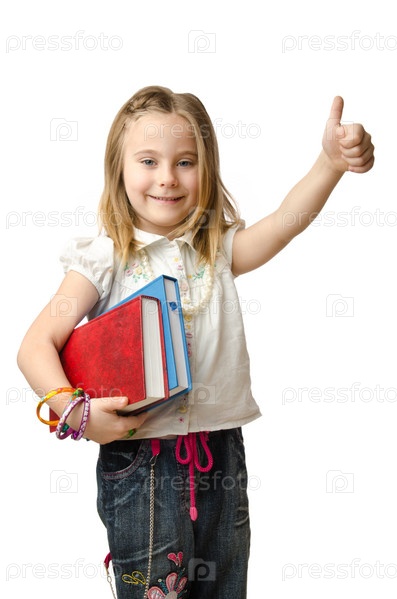 Маленькая девочка с книгами на белом фоне