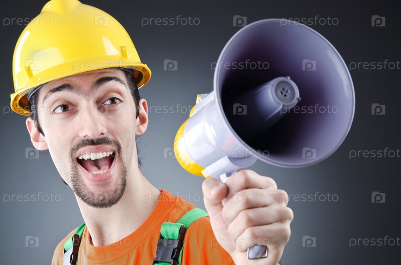 Строитель с громкоговорителем в студии