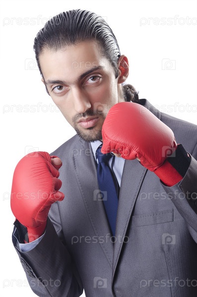 Бизнесмен в боксерских перчатках на белом фоне