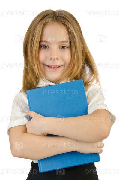 Маленькая девочка с книгами на белом фоне