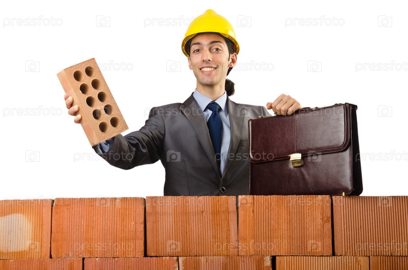 Бизнесмен с кирпичами на белом фоне