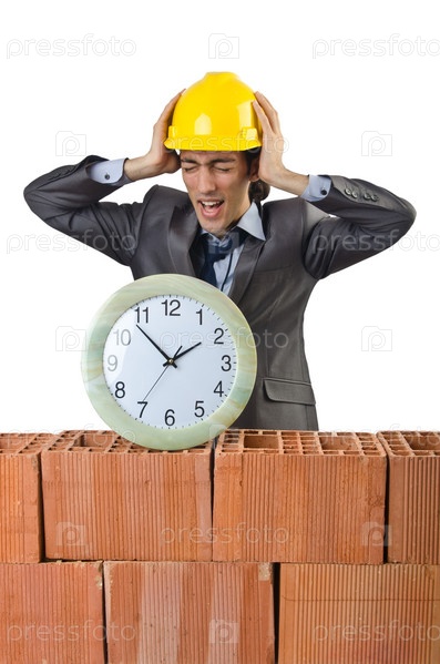 Бизнесмен с кирпичами на белом фоне