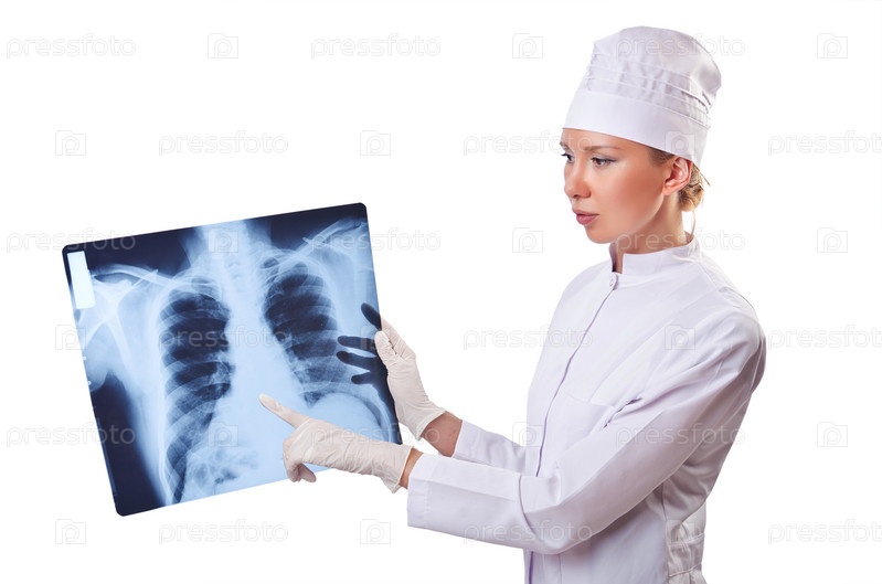 Женщина-врач изучает рентген на белом фоне