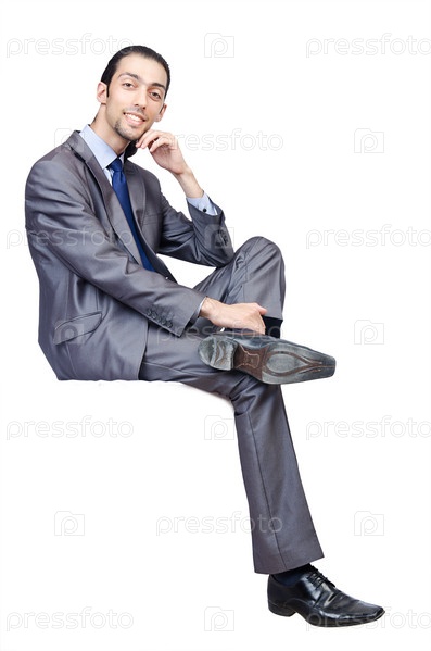 Бизнесмен сидит на белом фоне