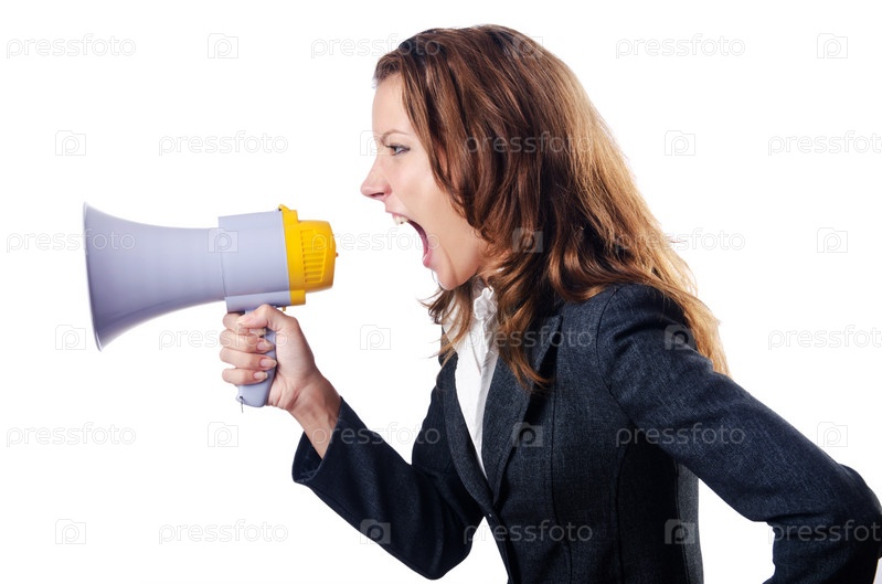 Предприниматель с громкоговорителем на белом фоне