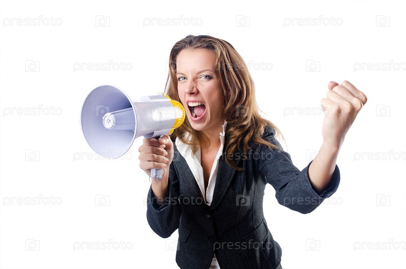 Предприниматель с громкоговорителем на белом фоне