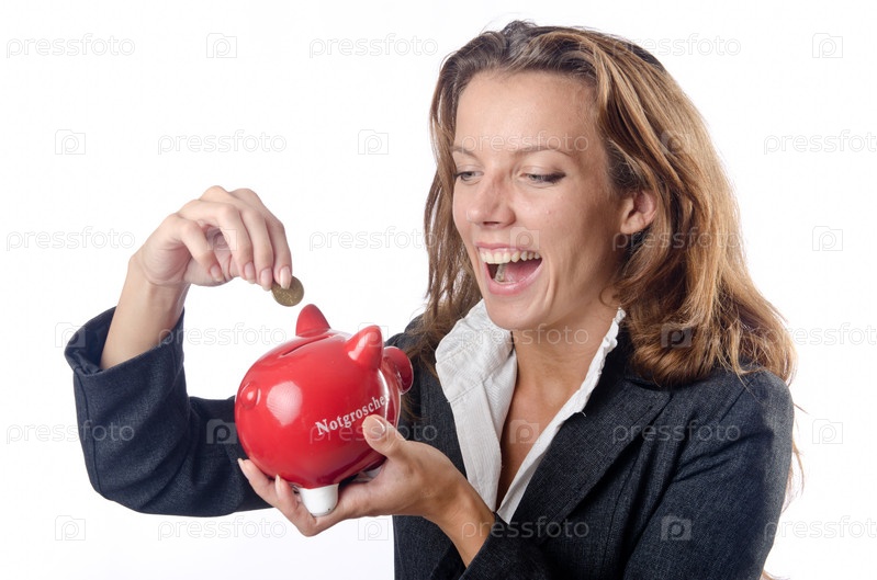Женщина с копилкой на белом фоне