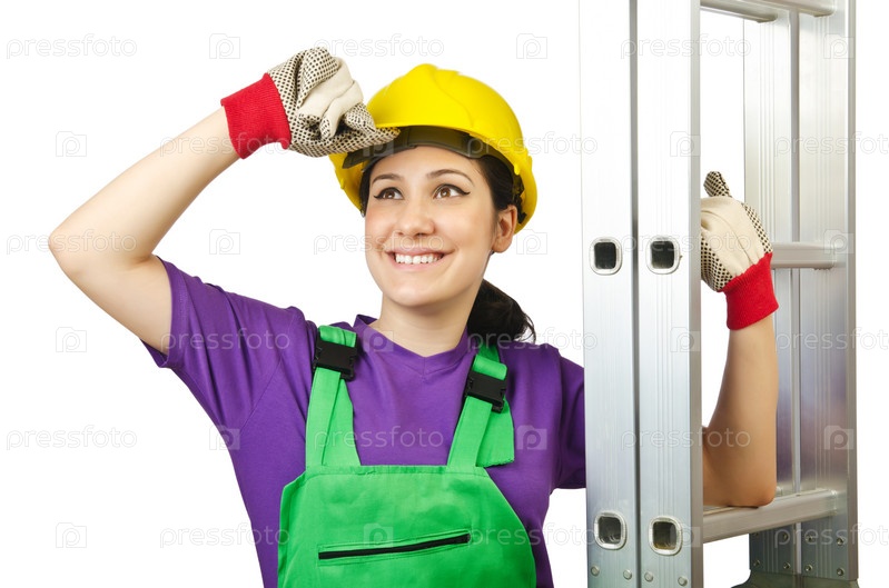 Женщина с лестницей на белом фоне