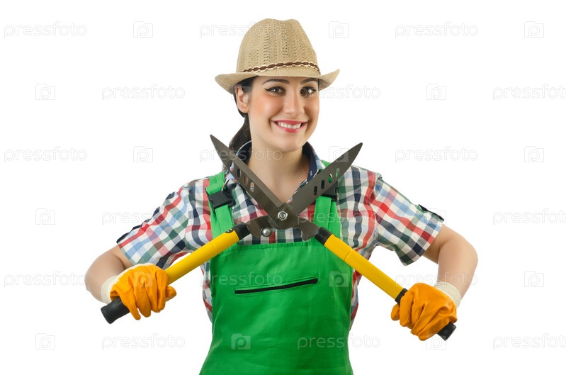 Девушка с садовыми ножницами на белом фоне